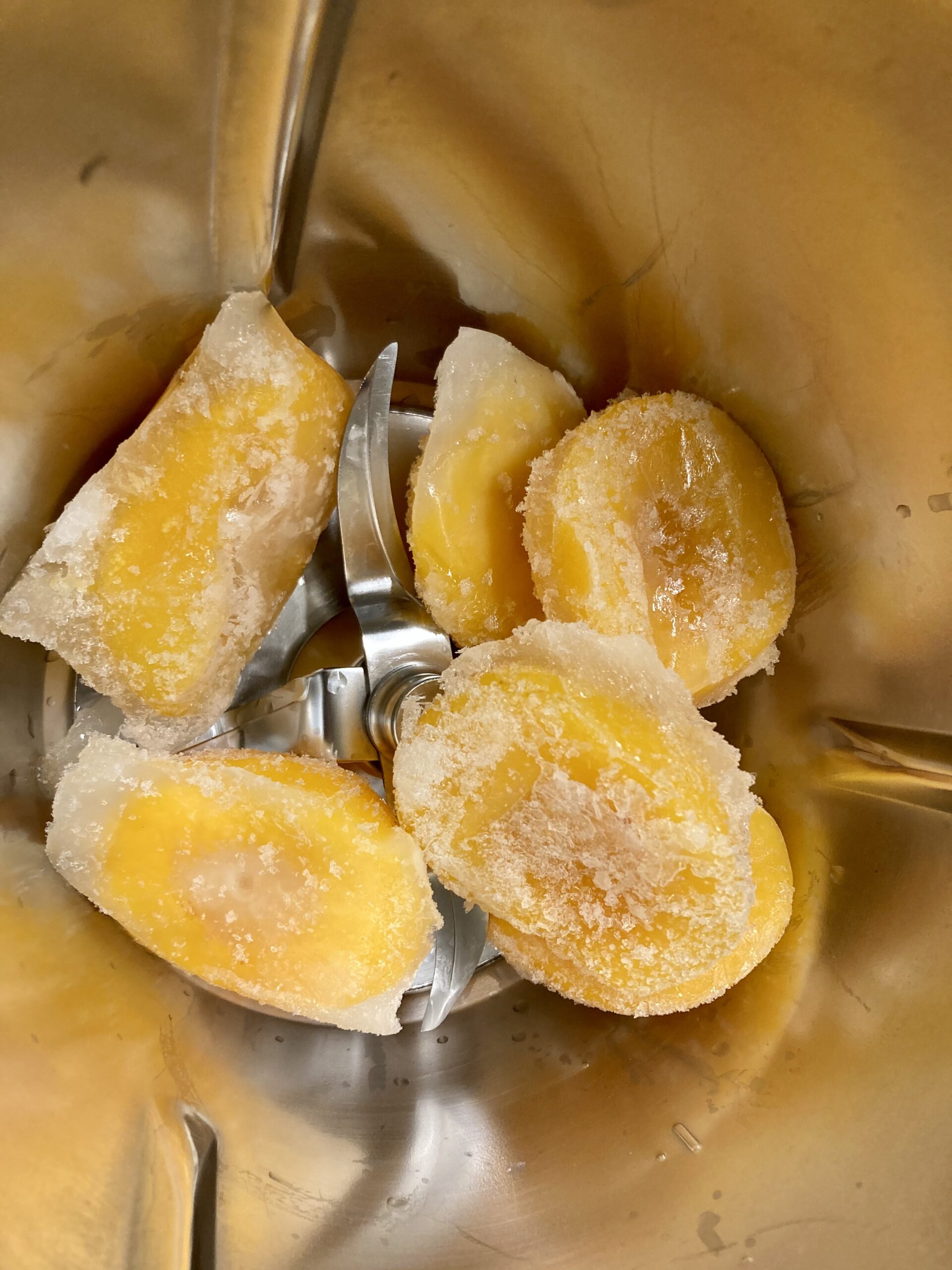 • Die gefrorenen Pfirsiche in den Mixtopf geben. 10 Sek/ Stufe 9 zerkleinern.