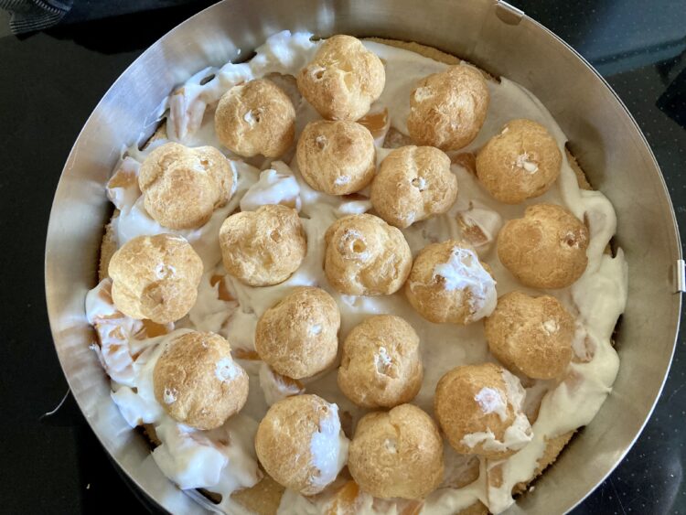 - Pfirsichstücke mit dem Spatel unter die Creme mischen. ca. 4 EL der Creme auf dem vorbereiteten Tortenboden verteilen. Die Windbeutel darauf verteilen und die restliche Creme darüber geben und glatt streichen. Ca. 1 Stunden im Kühlschrank anziehen lassen.